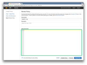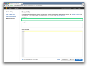 For this example, we’ll create a policy to allow read access to an S3 bucket named billing-example. For other policies, just change the policy name, description, and policy document as appropriate.