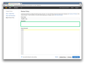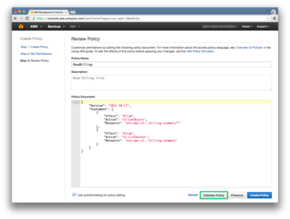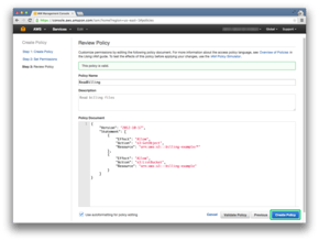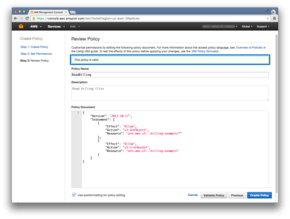 For this example, we’ll create a policy to allow read access to an S3 bucket named billing-example. For other policies, just change the policy name, description, and policy document as appropriate.
